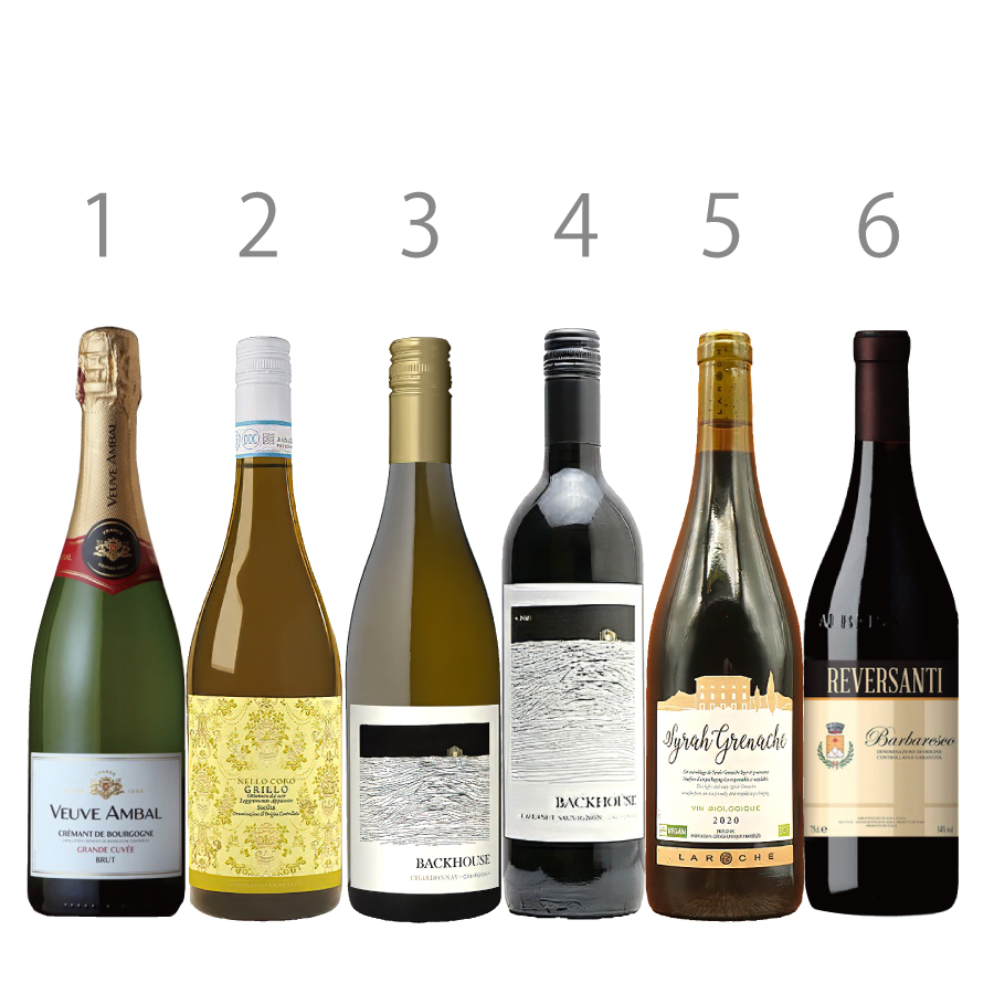 ■1.スパークリングワイン/ヴーヴ・アンバル クレマン・ド・ブルゴーニュ グラン・キュヴェ ブラン・ブリュット NV/参考上代: ¥3,366(税込) ■2.白ワイン/ネッロ・コーロ グリッロアパッシメント 2024/ 参考上代: 1,980(税込)■3.白ワイン/オニール・ヴィントナーズ&ディスティラーズ バックハウス・シャルドネ 2022 /参考上代: ¥2,200(税込)■4.赤ワイン/オニール・ヴィントナーズ&ディスティラーズ バックハウス・カベルネ・ソーヴィニヨン 2023 /参考上代: ¥2,200(税込)■5.赤ワイン/ラロッシュ シラー グルナッシュ 2020 /参考上代: ¥2,640(税込)■6.赤ワイン/レヴェルサンティ レヴェルサンティ バルバレスコ 2019 /参考上代: ¥6,050(税込)