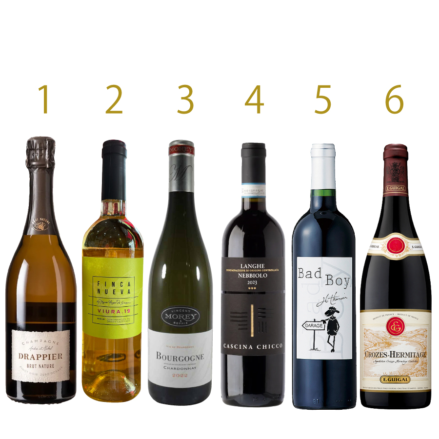 ■1.シャンパーニュ/ドラピエ ブリュット・ナチュール NV /参考上代: ¥9,900(税込)■2.白ワイン/フィンカ・ヌエヴァ ヴィウラ 2019/ 参考上代: ¥3,047(税込)■3.白ワイン/ヴァンサン・エ・ソフィー・モレ ブルゴーニュ・シャルドネ 2022/参考上代: ¥5,940(税込)■4.赤ワイン/カッシーナ・キッコ ランゲ・ネッビオーロ 2023/参考上代: ¥3,520(税込)■5.赤ワイン/シャトー・ヴァランドロー バッド・ボーイ 2018 /参考上代: ¥3,850(税込)■6.赤ワイン/E・ギガル クローズ エルミタージュ ルージュ 2020 /参考上代: ¥4,180(税込)