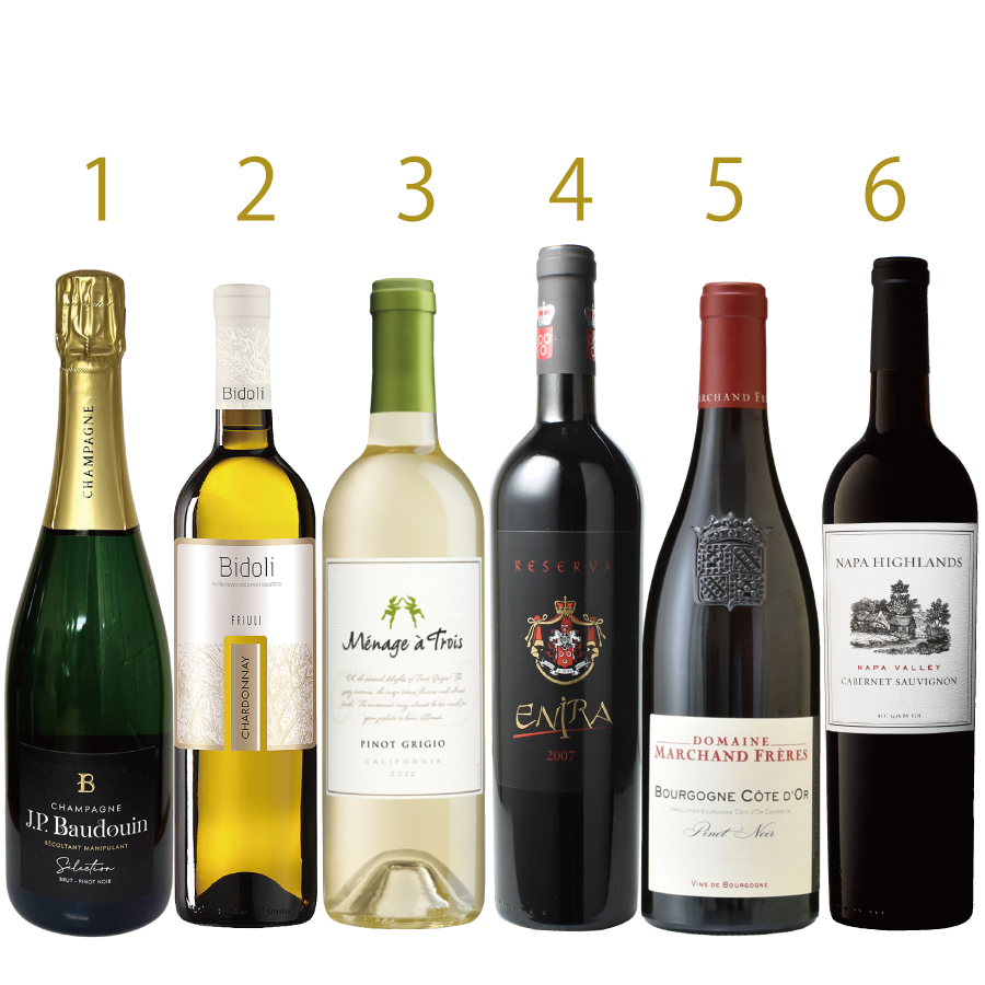 ■1.シャンパーニュ/JPボードゥアン ブリュット・キュヴェ・セレクション NV /参考上代: \8,250(税込)■2.白ワイン/ビードリ シャルドネ 2022/ 参考上代: \2,970(税込)■3.白ワイン/メナージュ・ア・トロワ ピノ・グリージョ 2023/参考上代: \4,972(税込)■4.赤ワイン/ベッサ・ヴァレー・ワイナリー エニーラ・レゼルヴァ 2007/参考上代: \4,840(税込)■5.赤ワイン/ドメーヌ マルシャン・フレール ブルゴーニュ・コート・ドール ピノ・ノワール 2023/参考上代: \6,050(税込)■6.赤ワイン/ナパ・ハイランズ カベルネ・ソーヴィニヨン ナパ・ヴァレー 2023/参考上代: \6,380(税込)